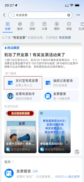 検索後に表示された「支付宝有奖発票」を押します。