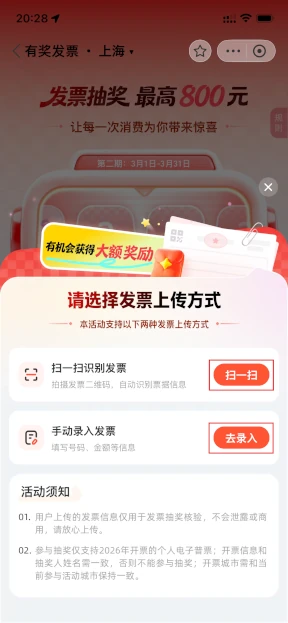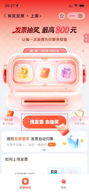 真ん中の「传发票· 去抽奖」を押して、発票のアップロード方法を指定します。