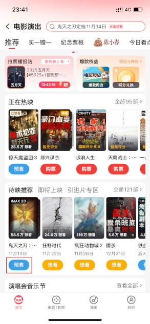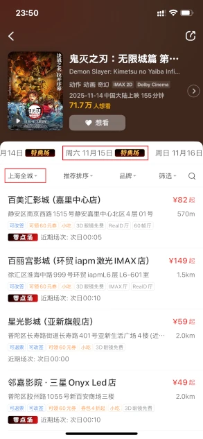 この下の[预售(予約購入)][购票]を選べばすぐに「鬼灭之刃」を上映する映画館を選ぶ画面に遷移します。