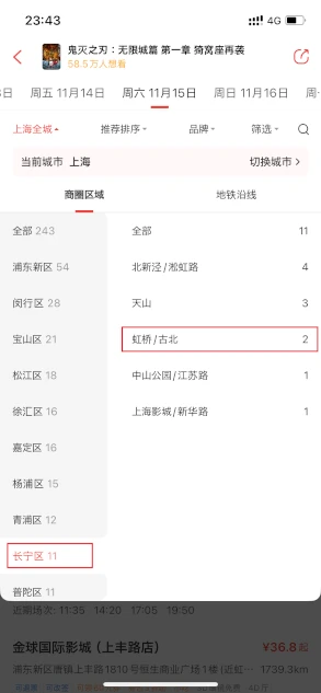 「日付」を選択します。映画館の場所は中段左の「上海全城(上海の場合)」を押すと一覧が表示されます。